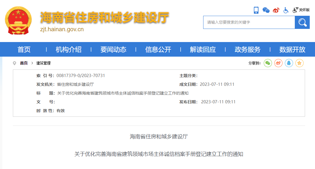 关于优化完善海南省建筑领域市场主体诚信档案手册登记建立工作的通知