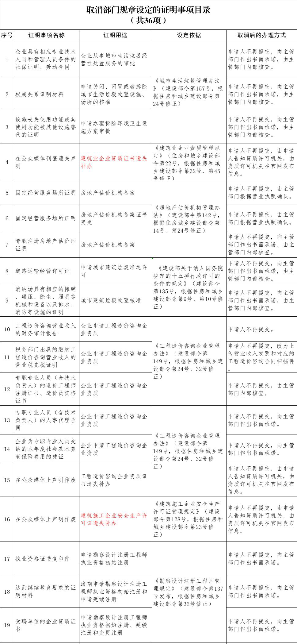 近期,住建部分两次共取消96个证明事项,涉及建筑业资质、执业注册等多项内容。